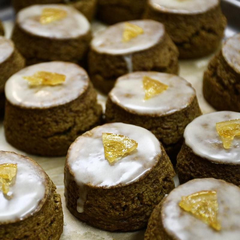 細かく粉砕した茶葉をしつこくない限界まで生地に混ぜ込みました。こんなに紅茶感が出せるとは…自分たちでも驚いてしまいました。そして美味しそうに表面に施されているのは「レモン味のアイシング」です。食べ進めているとしっとりしたスコーン生地と合わさってシャリシャリと心地よい食感。味の深みが増します。