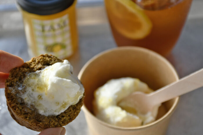 【ミルクティー×紅茶シロップ】ミルクティースコーンを横半分に割って、まんまるなミルクジェラートをのせます。その上に濃厚な紅茶シロップをかけて上部のスコーンでジェラートを挟みます。