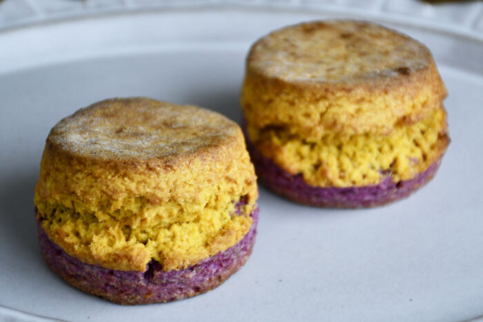 ハロウィンカラーで見た目も美しい葉々屋のセパレートスコーン。秋冬にぴったりなホクホクしっとり&リッチな味わいでお作りいたしました。縦半分に割って二種類を一緒に味わうのも楽しいし、オオカミの口から横半分にしてそれぞれ味わうとちょっと得した気分!